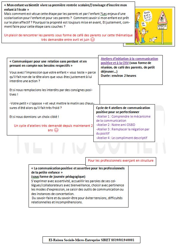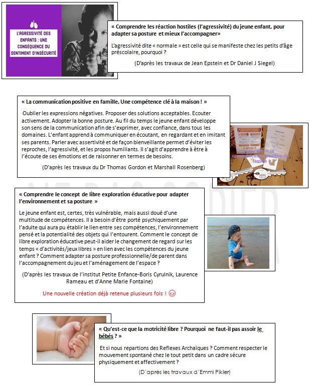 Certaines sont construites sur un format de conférence interactive avec des mises en situations, d’autres sont adaptables en journées pédagogiques (pour les professionnels), réunions thématiques et en café des parents ou des pros.